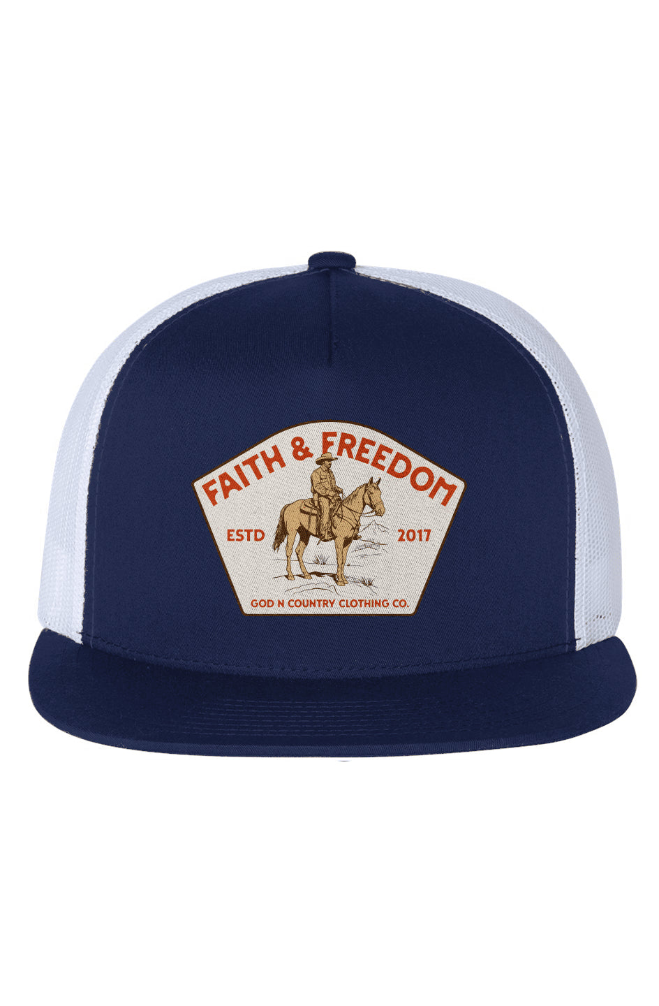 The God N Country White Mesh Five-Panel Trucker Cap is a timeless blend of style, comfort, and durability. Made from a 65% polyester / 35% cotton blend, this structured five-panel cap features a high-profile design with a flat visor, delivering a modern yet classic trucker look. The white mesh back ensures breathability and all-day comfort, making it ideal for outdoor wear. Designed with a snapback closure, this cap offers an adjustable, one-size-fits-most fit for versatility and convenience.